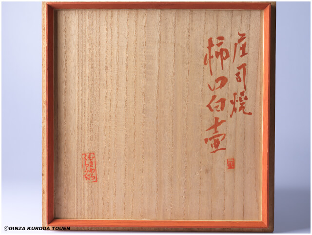 庄司燒 柿口白壺と朱墨で揮毫され、朱印で「二郎」